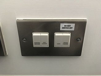 The Washer Dryer, Dishwasher, Oven and Fridge Freezer each have their own isolation switch. If any of these kitchen appliances are not working, please check that all the isolation switches are in the ON position.